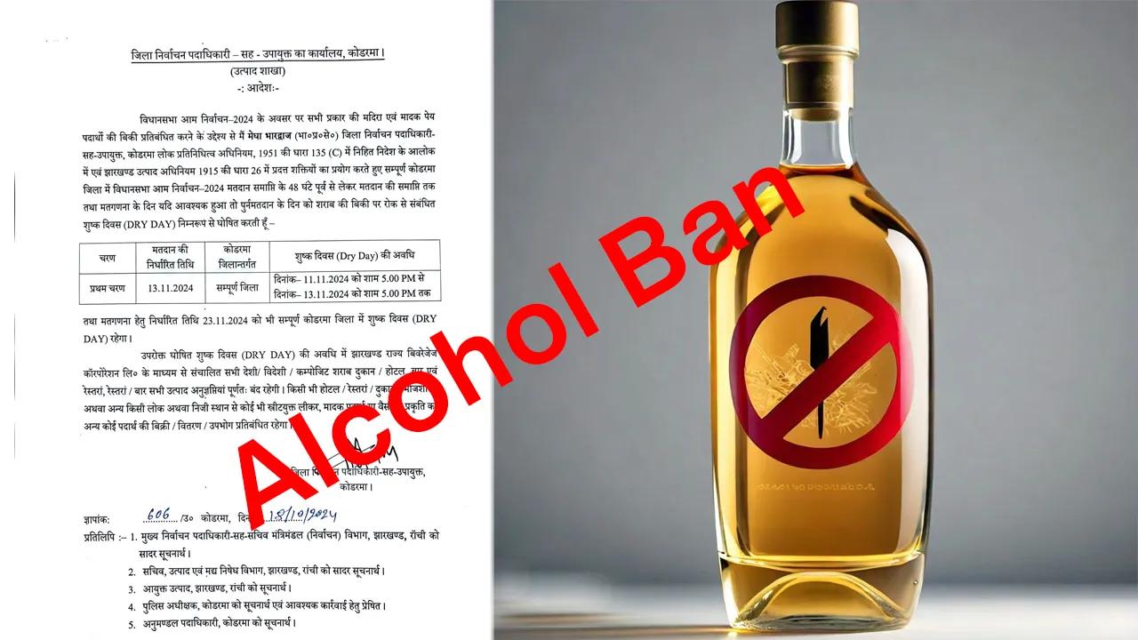 कोडरमा जिले में विधानसभा आम निर्वाचन-2024 के अवसर पर जिला निर्वाचन पदाधिकारी-सह-उपायुक्त मेघा भारद्वाज द्वारा मदिरा और मादक पेय पदार्थों की बिक्री पर रोक लगाने का आदेश जारी किया गया है। यह आदेश लोक प्रतिनिधित्व अधिनियम, 1951 की धारा 135 (सी) और झारखंड उत्पाद अधिनियम, 1951 की धारा 26 के तहत जारी किया गया है। मतदान समाप्ति से 48 घंटे पूर्व से लेकर मतदान की समाप्ति तक शुष्क दिवस (Dry Day) घोषित किया गया है।