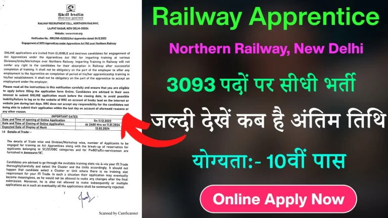 RRC Northern Railway Apprentice: दोस्तों हाल ही में Railway Recruitment Cell (RRC), Northern Railway की द्वारा Apprenticeship के लिय 3093 …