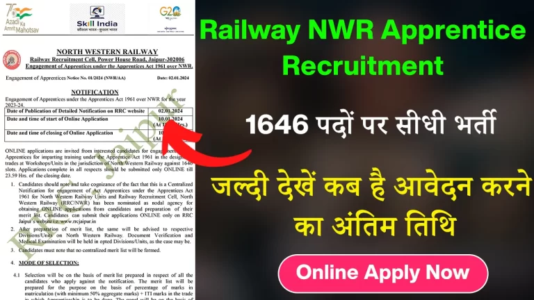 RRC NWR Apprentice Recruitment: हाल ही में Railway RRC NWR (North Western Railway), Jaipur के द्वारा Apprentice के लिए नई …