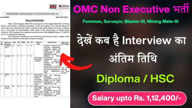 OMC Non Executive Recruitment: दोस्तों हाल ही में Odisha Mining Corporation Ltd (OMC) के द्वारा Non Executive (Foreman, Surveyor, Blaster-III, Mining …