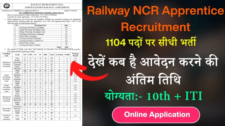 Railway NCR Apprentice Recruitment: दोस्तों हाल ही में RRC, North Eastern Railway, Gorakhpur ने Apprentice Training के भर्ती के लिए नई …