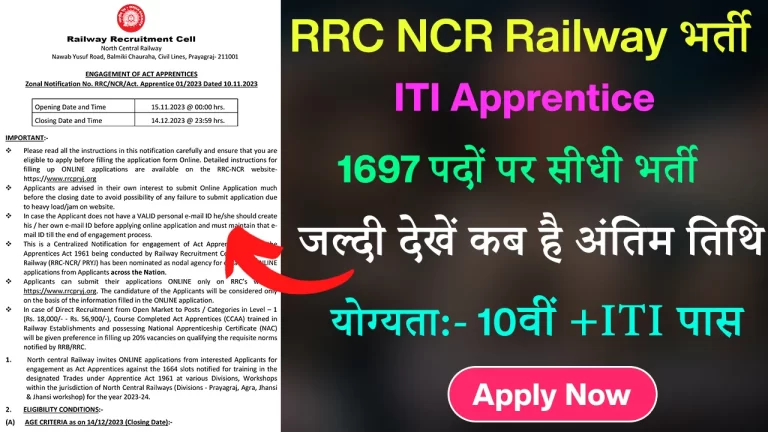Railway NCR Apprentice Bharti: दोस्तों हाल ही में RRC, North Central Railway के द्वारा नई Apprentice भर्ती की अधिसुचना जारी …