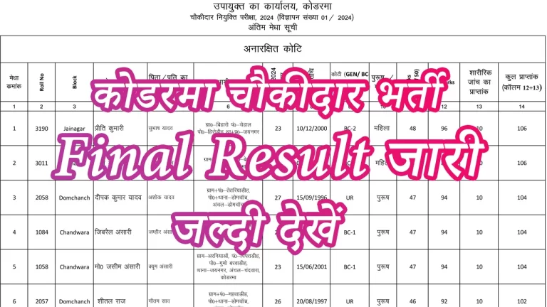 कोडरमा चौकीदार भर्ती के लिए लिखित परीक्षा एवं शारीरिक दक्षता परीक्षा में पास अभ्यर्थियों की Final Merit List जारी कर …