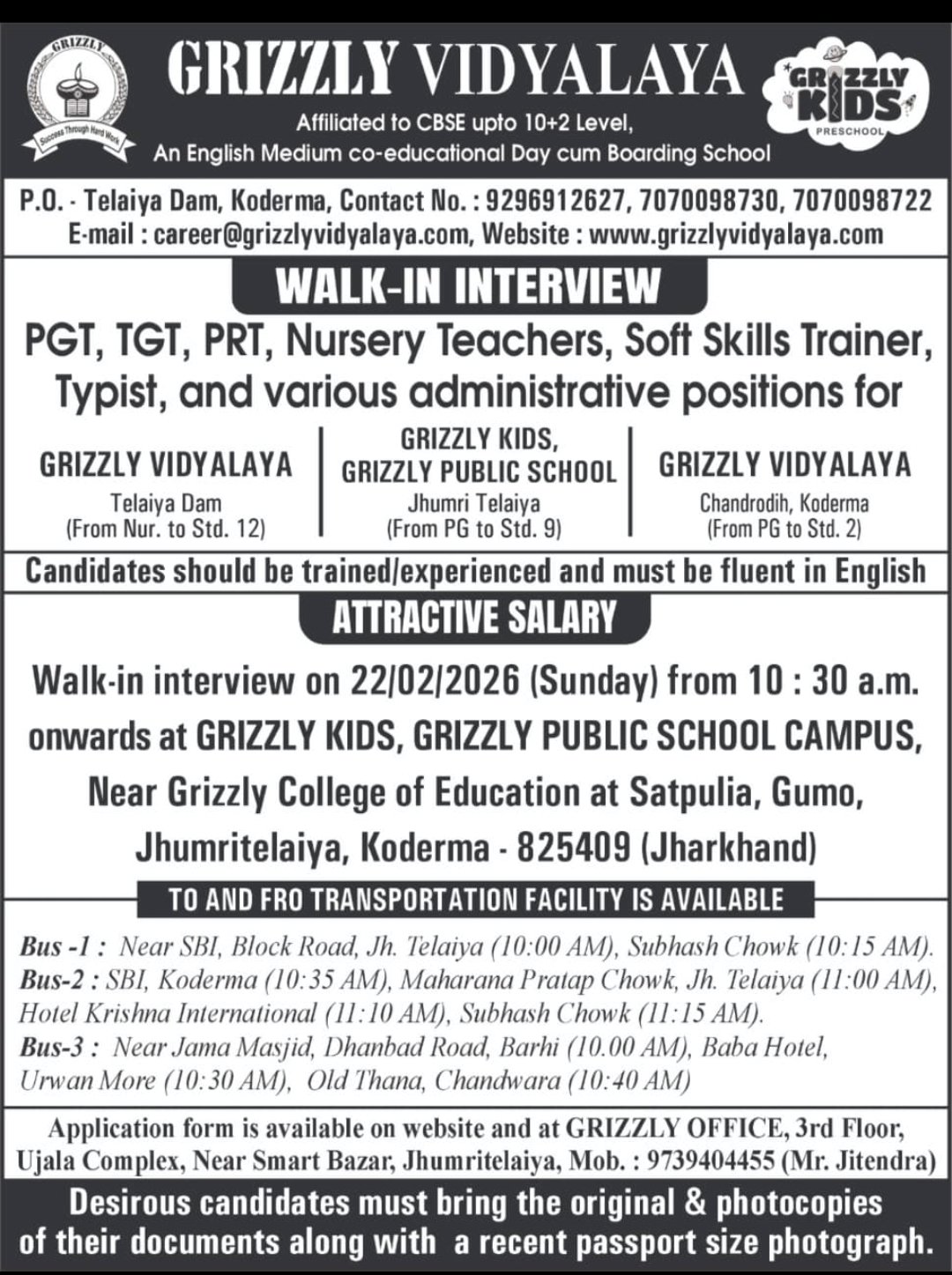 Grizzly Vidyalaya, Koderma — Walk-in Interview 2026