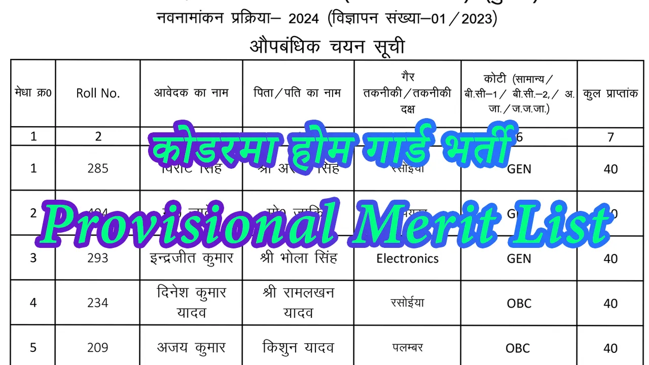 कोडरमा होम गार्ड भर्ती के लिए ग्रामीण एवं शहरी (महिला/पुरुष) अभ्यर्थियों का शारीरिक जाँच एवं परीक्षा एवं हिंदी लेखन क्षमता परीक्षा आयोजित की गयी थी | जिसके लिए सफल अभ्यर्थियों का Provisional Merit जारी कर दिया गया है |