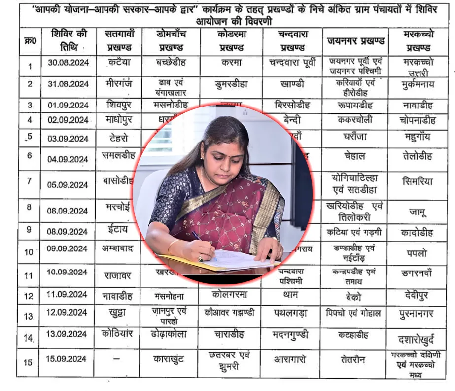 कोडरमा जिले के सभी प्रखंडों में 30 अगस्त से 15 सितंबर तक “आपकी योजना, आपकी सरकार, आपके द्वार” कार्यक्रम के तहत शिविर आयोजित किए जाएंगे। झारखंड सरकार के मुख्य सचिव के मार्गदर्शन में इन शिविरों का आयोजन किया जा रहा है, जिसका उद्देश्य राज्य सरकार की महत्वाकांक्षी योजनाओं का लाभ सभी योग्य लाभुकों तक पहुंचाना है।